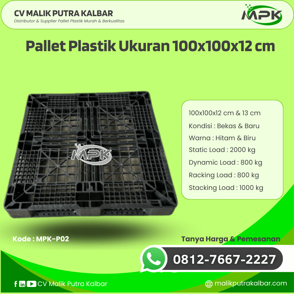 Dalam era industri yang semakin kompetitif, efisiensi dalam sistem logistik dan penyimpanan menjadi salah satu kunci keberhasilan operasional. Untuk mendukung kebutuhan tersebut, CV Malik Putra Kalbar menghadirkan produk unggulan kami: Pallet Plastik Bekas/Baru Ukuran 100x100x12 cm (Kode Produk: MPK-P02) – pilihan cerdas dan hemat biaya bagi para profesional procurement, pemilik bisnis, hingga broker logistik yang mengutamakan kualitas dan keandalan.