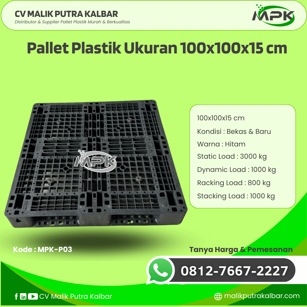 Dalam dunia industri yang terus berkembang, keandalan dalam proses distribusi dan penyimpanan barang menjadi kebutuhan utama. Untuk menjawab kebutuhan tersebut, CV Malik Putra Kalbar, perusahaan terpercaya dalam penjualan pallet plastik bekas maupun baru, menghadirkan produk unggulan: Pallet Plastik Ukuran 100x100x15 cm – Kode Produk MPK-P03. Produk ini dirancang dengan memperhatikan kekuatan, efisiensi, serta standar mutu internasional, menjadikannya solusi ideal bagi para profesional procurement, pemilik bisnis, maupun broker logistik.