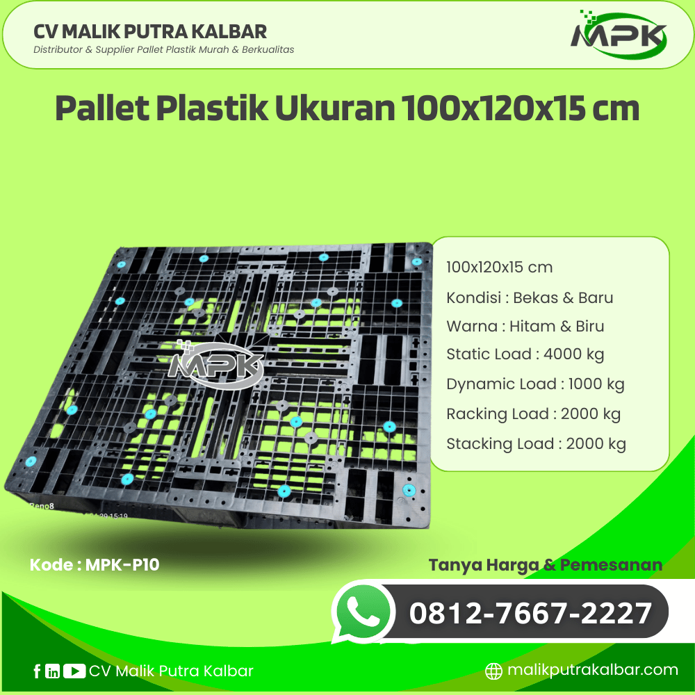 Dalam dunia industri modern, kebutuhan akan media penyimpanan dan distribusi barang yang kokoh, efisien, serta memenuhi standar internasional menjadi semakin penting. Menjawab kebutuhan tersebut, CV Malik Putra Kalbar, penyedia pallet plastik terpercaya, mempersembahkan produk unggulan kami: Pallet Plastik Bekas/Baru Ukuran 100x120x15 cm (MPK-P10). Produk ini menjadi solusi tepat untuk mendukung operasional gudang, distribusi, dan logistik perusahaan Anda secara optimal.