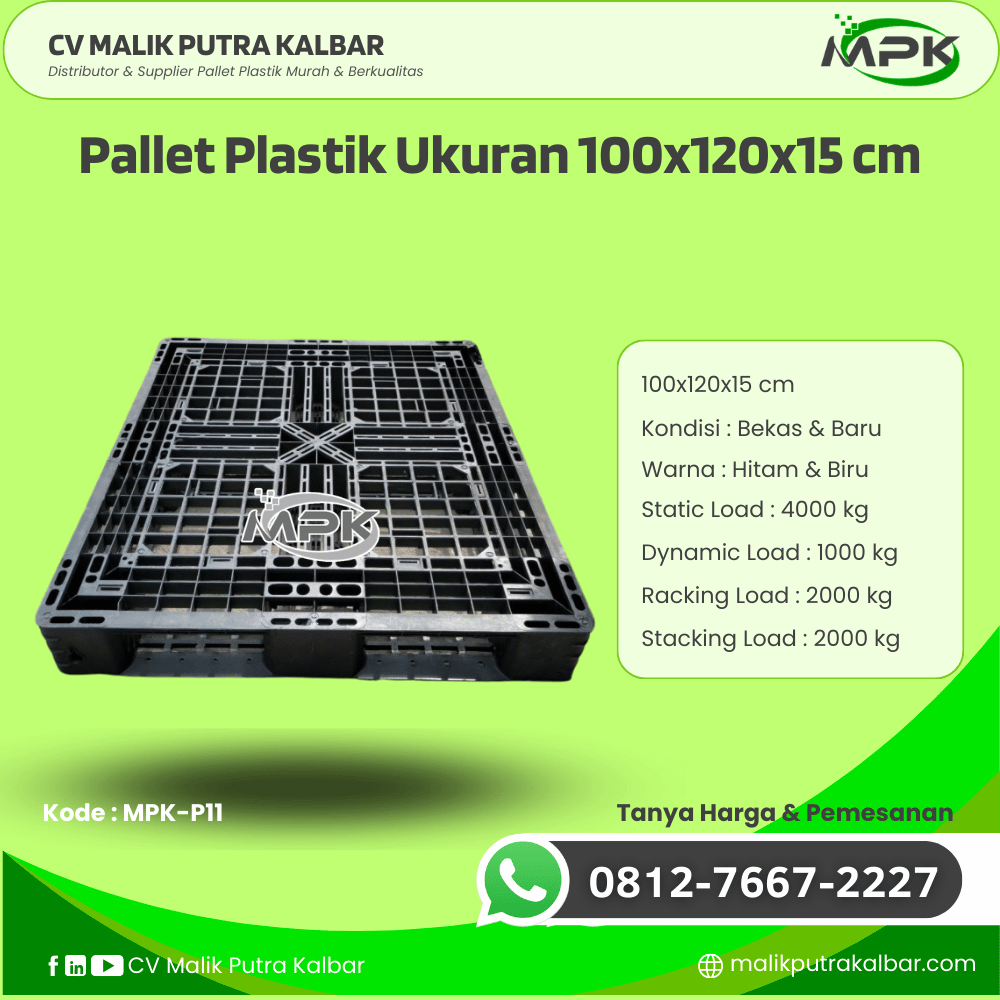 Dalam kegiatan operasional logistik dan distribusi, efisiensi dan keandalan adalah dua faktor utama yang menentukan kelancaran proses bisnis. Menjawab kebutuhan akan media penyimpanan dan pengangkutan yang tangguh, tahan lama, dan ekonomis, CV Malik Putra Kalbar menghadirkan produk unggulan kami: Pallet Plastik Bekas/Baru Ukuran 100x120x15 cm dengan Kode Produk MPK-P11.
