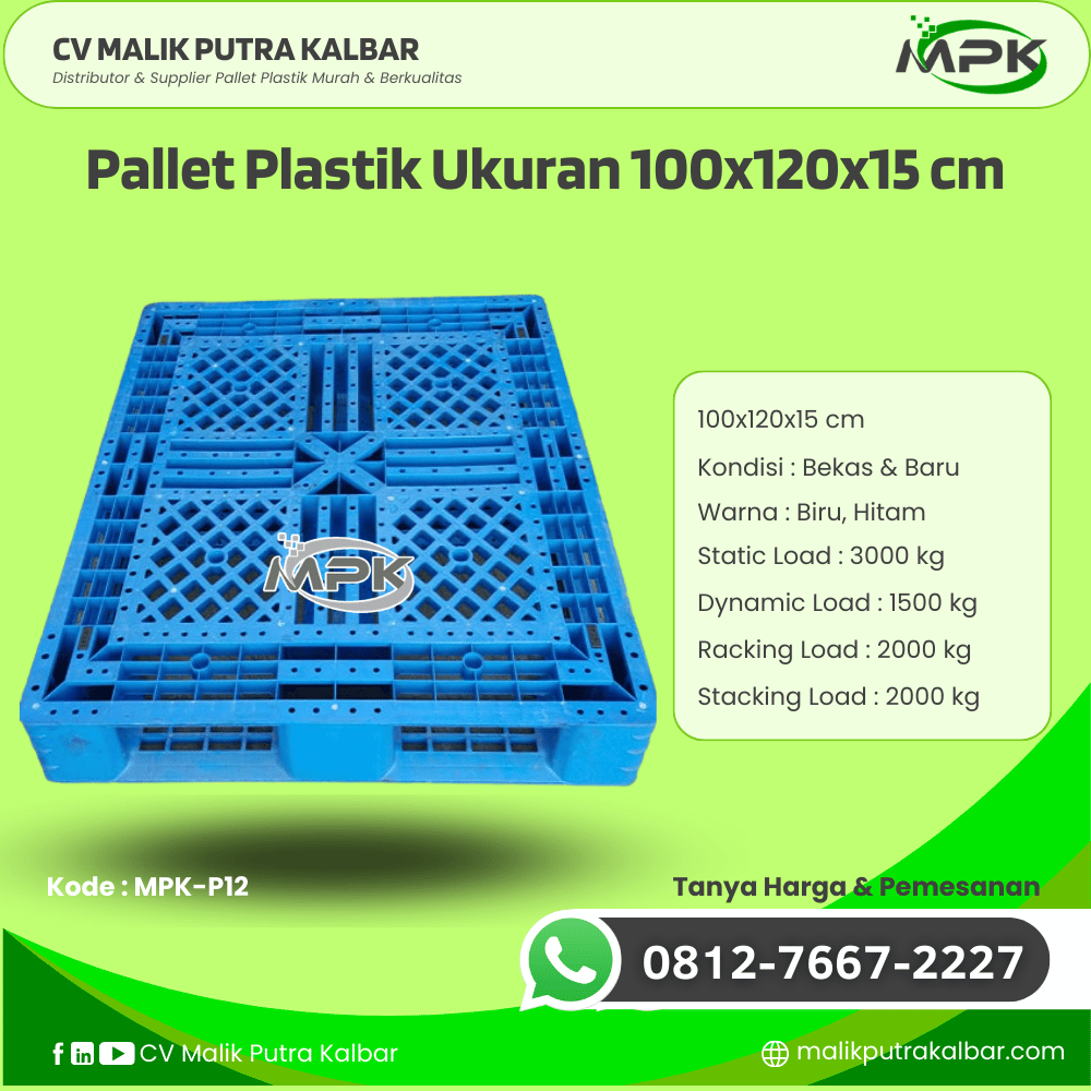 Dalam dunia industri dan distribusi modern, efektivitas proses logistik menjadi kunci keberhasilan. Salah satu elemen penting dalam sistem logistik yang efisien adalah pemilihan pallet yang tepat—baik dari segi kekuatan, daya tahan, maupun efisiensi biaya. Menjawab kebutuhan tersebut, CV Malik Putra Kalbar dengan bangga mempersembahkan produk andalannya: Pallet Plastik Bekas/Baru Ukuran 100x120x15 cm, dengan kode produk MPK-P12.