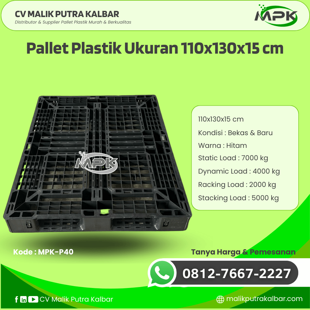 Dalam dunia industri dan logistik, pemilihan pallet yang tepat berperan penting dalam meningkatkan efisiensi penyimpanan serta distribusi barang. CV Malik Putra Kalbar hadir sebagai solusi terpercaya dalam menyediakan pallet plastik bekas dan baru dengan kualitas tinggi serta harga yang kompetitif. Salah satu produk unggulan kami adalah Pallet Plastik Bekas/Baru MPK-P40 dengan ukuran 110x130x15 cm.