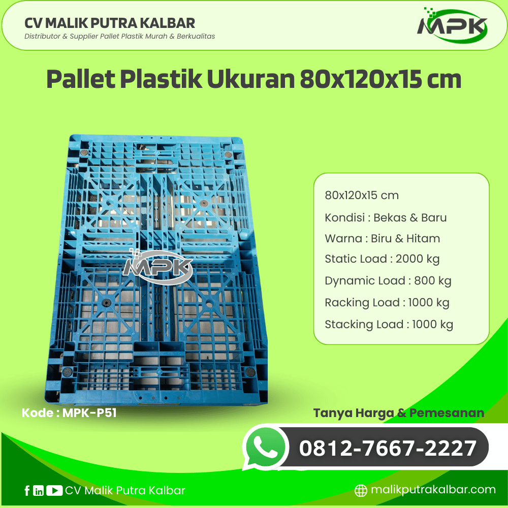 Dalam dunia industri dan distribusi, efisiensi logistik sangat bergantung pada sarana penunjang yang andal, salah satunya adalah penggunaan pallet plastik berkualitas. Menjawab kebutuhan tersebut, CV Malik Putra Kalbar menghadirkan produk Pallet Plastik Bekas/Baru Ukuran 80x120x15 cm – MPK-P51, pilihan tepat bagi Anda yang membutuhkan kombinasi kekuatan, daya tahan, dan efisiensi biaya.